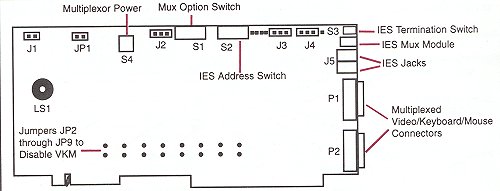 Connect the unused VKM connector on the first system to the Video/Keyboard/ Mouse Breakout Module, using DB-25 cabling. (VKM Module can be mounted in the top of the System 1010 cabinet or wherever it is convenient.) If the monitor, keyboard, and mouse are not already connected to the breakout module, route the cables for these devices into the cabinet via the access hole in the top cover and connect the cables to the breakout module. Connect the video terminator plug to the unused VKM connectors on the last system. Note:JP2 through JP9 are available for customers who wish to disable VKM for selected groups (see Figure 4) and use their own external VKM. For more information contact Customer Service. Multiplexor/IES Switches and Cabling The Multiplexor/IES board is installed in the leftmost backplane slot as you face the front of the Density System. The switches can be accessed by removing the top cover of the system. Figure 1 shows the layout of the Multiplexor/IES board.