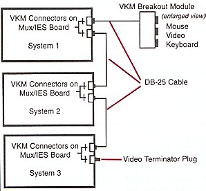 VKM (Video, Keyboard and Mouse) Cabling These devices may be shared between multiple systems. This is accomplished by daisy-chaining the systems together with DB-25 male to male cables attached to the VKM connectors which are located on the back of the Mux/IES board (see figure below). A maximum number of eight Density chassis may be VKM connected.